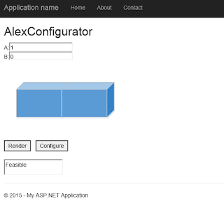 @{ ViewBag.Title = "Index"; var a = Request.Params["A"]; var b = Request.Params["B"]; var output = ""; var service = new AlexConfigurator.ServiceReference1.AlexConfiguratorServiceClient(); service.ClientCredentials.Windows.ClientCredential.Domain = "contoso"; service.ClientCredentials.Windows.ClientCredential.UserName = "Admin"; service.ClientCredentials.Windows.ClientCredential.Password = "pass@word1"; var context = new AlexConfigurator.ServiceReference1.CallContext(); context.Company = "usmf"; var ret = service.solve(context, a.AsInt(), b.AsInt()); if (ret == true) { output = "Feasible"; } else { output = "Infeasible"; } ViewBag.Title = output; } <scripttype="text/javascript"> function Render() { var textA = document.getElementById('TextA'); var textB = document.getElementById('TextB'); var img = document.getElementById('Img'); var textAreaOutput = document.getElementById('TextAreaOutput'); if (textA.value == "" || textB.value == "" || (textA.value == "0"&& textB.value == "0")) { img.setAttribute("src", "/Images/NANB.png"); textAreaOutput.textContent = "NANB"; } elseif (textA.value == "0"&& textB.value == "1") { img.setAttribute("src", "/Images/NAB.png"); textAreaOutput.textContent = "NAB"; } elseif (textA.value == "1"&& textB.value == "0") { img.setAttribute("src", "/Images/ANB.png"); textAreaOutput.textContent = "ANB"; } elseif (textA.value == "1"&& textB.value == "1") { img.setAttribute("src", "/Images/AB.png"); textAreaOutput.textContent = "AB"; } } function Configure() { var textA = document.getElementById('TextA'); var textB = document.getElementById('TextB'); var url = "Index?"+ "A="+ textA.value.toString() + "&"+ "B="+ textB.value.toString(); return url; } </script> <h2>AlexConfigurator</h2> A:<inputid="TextA"type="text"value="@a"/> </br> B:<inputid="TextB"type="text"value="@b"/> </br></br> <imgid="Img"src="~/Images/NANB.png"alt=""/> </br></br> <inputid="ButtonRender"type="button"value="Render"onclick="Render()"/> <inputid="ButtonConfigure"type="button"value="Configure"onclick="document.location.href(Configure())"/> </br></br> <textareaid="TextAreaOutput"rows="2"cols="20">@output</textarea> |
